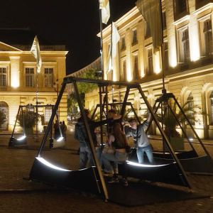 Au Mont des Arts, jusqu’au samedi 31 décembre, de 12h à 22h, nous sommes attendus par une création de « Chevalvert », un studio parisien de design, l’« Éloge de l’Air », né d’une co-production innovante entre la Ville de Bruxelles, le « Festival international Constellations », à Metz, et la Ville de Montréal, nous proposant une installation interactive, sobre et minimale, dédiée au voyage et à la collaboration intercontinentale, tout en incarnant l’idée de mouvement. Il s’agit de 9 balançoires à 2 sièges, rehaussées d’un drapeau doté d’une certaine transparence aux réflexions dorées, nous invitant à nous balancer, pour activer les lumières, sises de part et d’autre des balançoires.