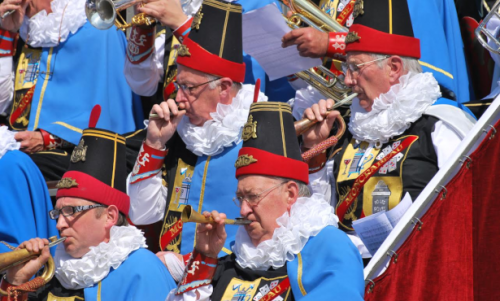 Soulignons la présence, au sein de ce cortège, dans leurs costumes propres au XVIIè siècle, des « Alfers namurois » – maîtres du lancer des drapeaux, accompagnés de leurs tambours et fifres, créés, en 1950, à l’occasion de la « Joyeuse Entrée », à Namur, du Roi Baudouin – ainsi que des « Echasseurs Namurois », dont la présence est attestée dès 1411, alors que, depuis le 16 décembre 2021, les « Joutes sur Echasses de Namur » sont reprises sur la liste représentative du « Patrimoine Culturel Immatériel de l’Humanité » de l’ « UNESCO », un premier combat officiel entre Echasseuses devant se dérouler, en septembre 2022, lors de l’ « Echasse d’Or » des prochaines « Fêtes de Wallonie ».
