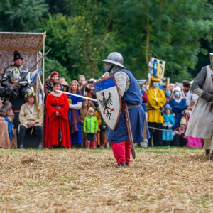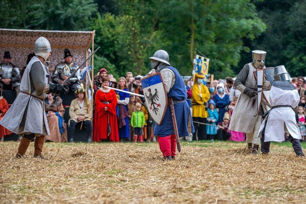 – de 14h15 à 16h15 : des démonstrations d’escrime, telles qu’au XIIIe siècle (« Compagnie du Furet ») ; une présentation de copies d’armes et d’armures du XVe siècle (« Compagnie Franche ») ; & la présence de l’école du soldat du XVIIIe siècle (« Bataillon des Canaris »).