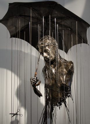 Une autre artiste, Raphaëlle Schotsmans, ayant réalisé nombre de photographies pour le « BIFFF » (« Bal des Vampires », « Body Building Contest », …), met en scène, dans différentes séries, sa fascination pour la transgression et les mystères de la psyché humaine. Elle nous convie, ici, à une métamorphose, mettant en scène une ballerine, évoluant tantôt en ployant sous le poids d’une main imaginaire, tantôt en s’élevant vers les airs, sa légèreté étant empêchée par les gravats qui jonchent le sol, se défaisant de tout ce qui entache sa pureté, luttant contre des forces invisibles. Sont-elles à l’extérieur ou bien en elle ? Les débris, au sol, précèdent-ils son passage ou est-ce qu’ils lui succèdent ? Rien ne se dévoile au premier regard, il faut embrasser la série dans son intégralité, pour en percevoir toute l’étendue symbolique, inspirée par l’imaginaire de l’horreur et du fantastique,