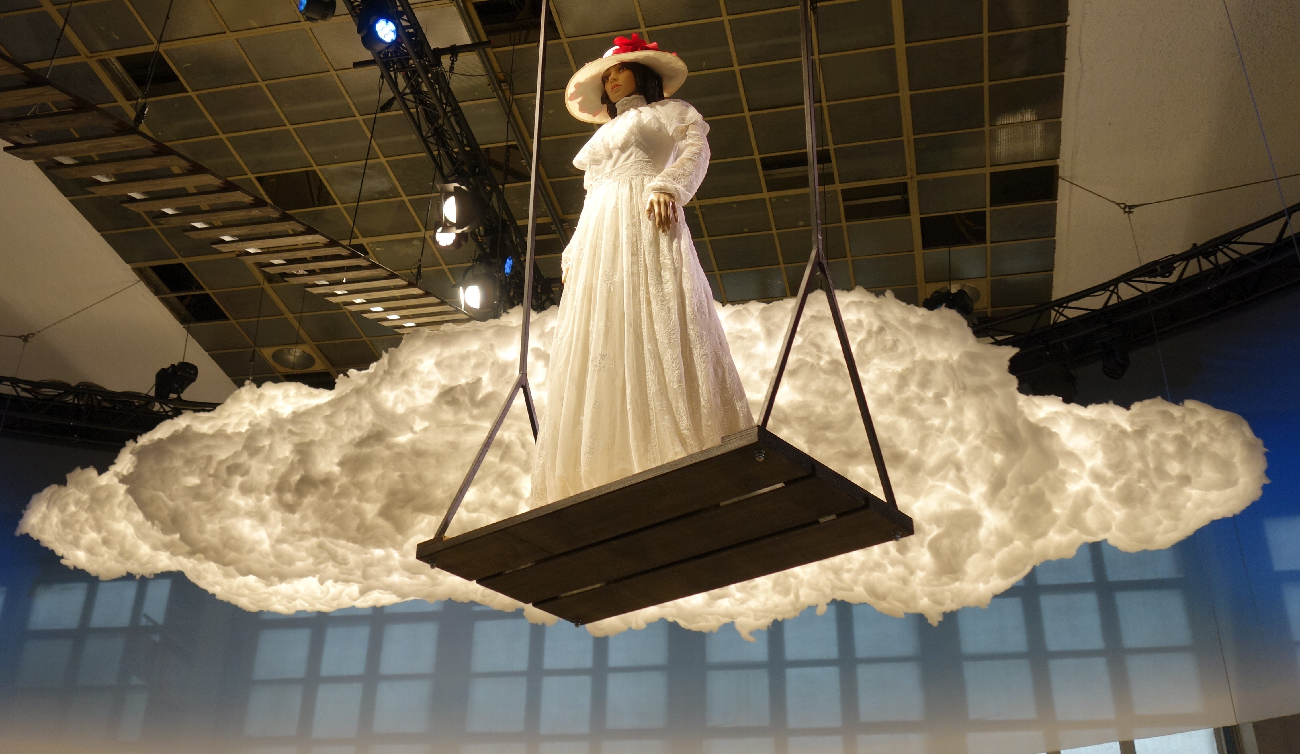 Saluons au passage la fort belle scénographie, dédiée à Paul Delvaux, avec de grands nuages, rails de trains & éléments de peintures suspendus, créés en 3 dimensions, ainsi qu’une installation d’oyats et de sable, sans oublier le tapis de sol, en nylon recyclé, créé selon le dallage peint par l’artiste, dans « L’Hiver » (1958), une toile conservée aux « Musées Royaux des Beaux-Arts de Belgique ».