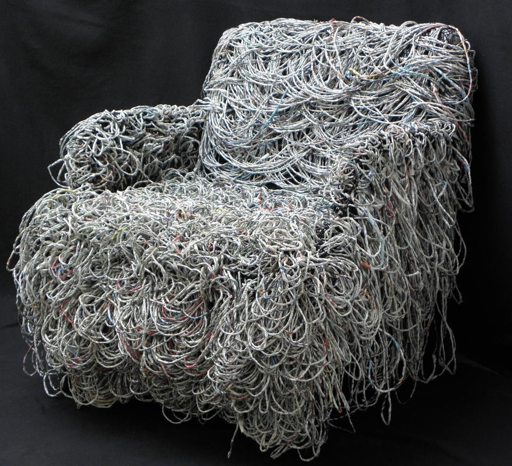Dans la même grande salle, Cécile Ahn expose des oeuvres étonnantes, en papier, nous déclarant : « Prolongeant les couleurs de l’été, j’utilise des papiers de récupération : des journaux, des magazines, … Ce matériau de base que tout le monde a chez soi, je le transforme patiemment en fil, pour obtenir des pelotes que je tricote par la suite avec des points de base. »