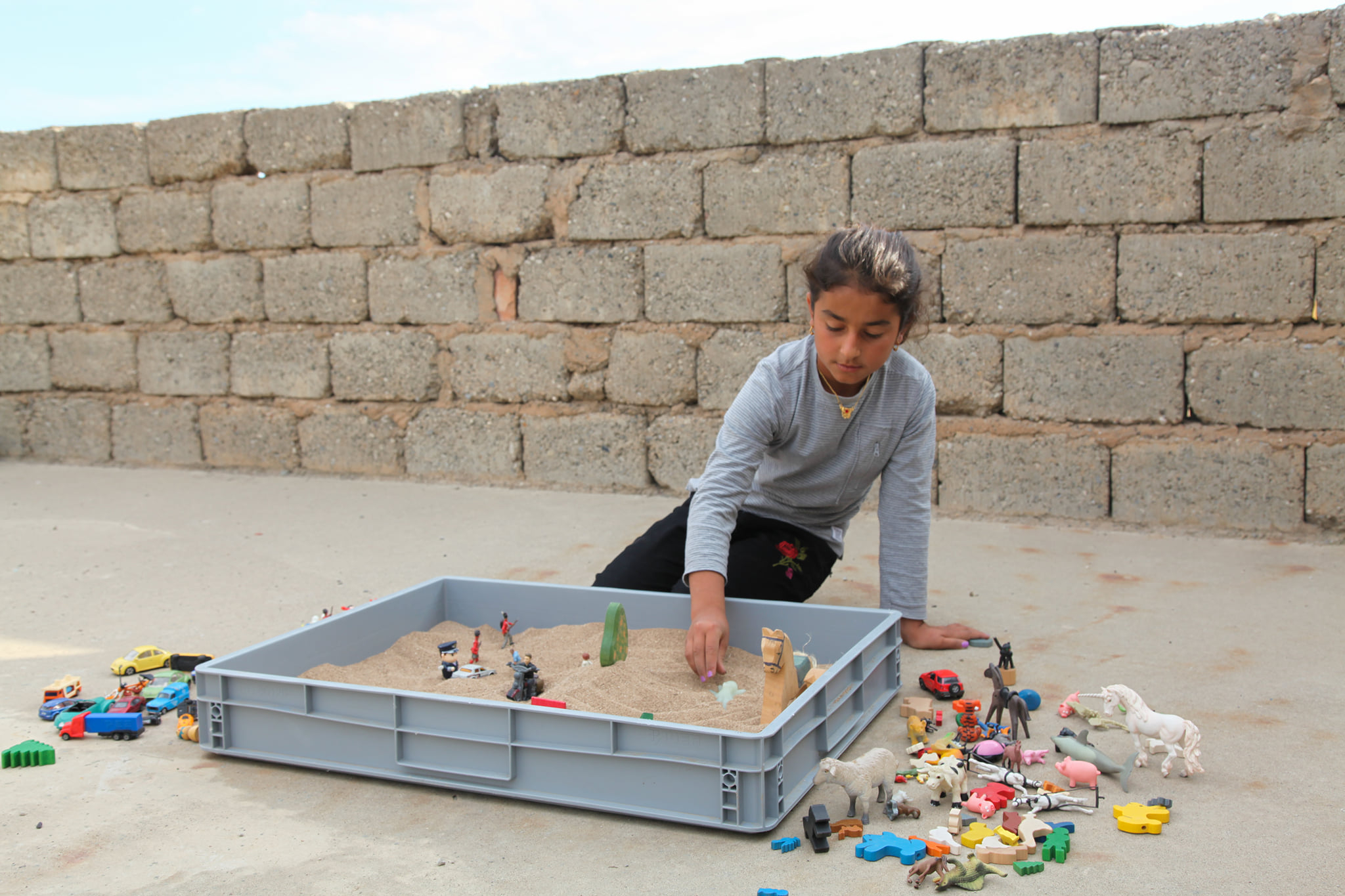De l’autre côté du patio, nous trouvons les travaux de deux artistes, Lisa Matthys, d’abord, qui – diplômée de l’ « Université des Arts », à Berlin, et de la « Sint Lucas Hogeschool » d’Antwerpen –, grâce à un court-métrage documentaire sous-titré, « The Survivor » (« La Survivante »), nous permet d’écouter une fillette yasidiste, filmée dans la campagne irakienne du Kurdistan. Ensuite nous la voyons, lors d’une intervention thérapeutique, durant laquelle elle retrace, dans un calme surprenant, son histoire de petite fille, reconstituant ce qu’elle a vécu, avec des figurines en plastique, qu’elle déplace dans un bac à sable, elle qui, autrefois, fut détenue, plusieurs années, dans un camp de Daech, où elle était souvent privée de nourriture. « Parfois, pour tout repas, nous recevions un oeuf pour deux personnes », nous confie-t-elle, des extraits de son témoignage étant accessibles sur le site web :