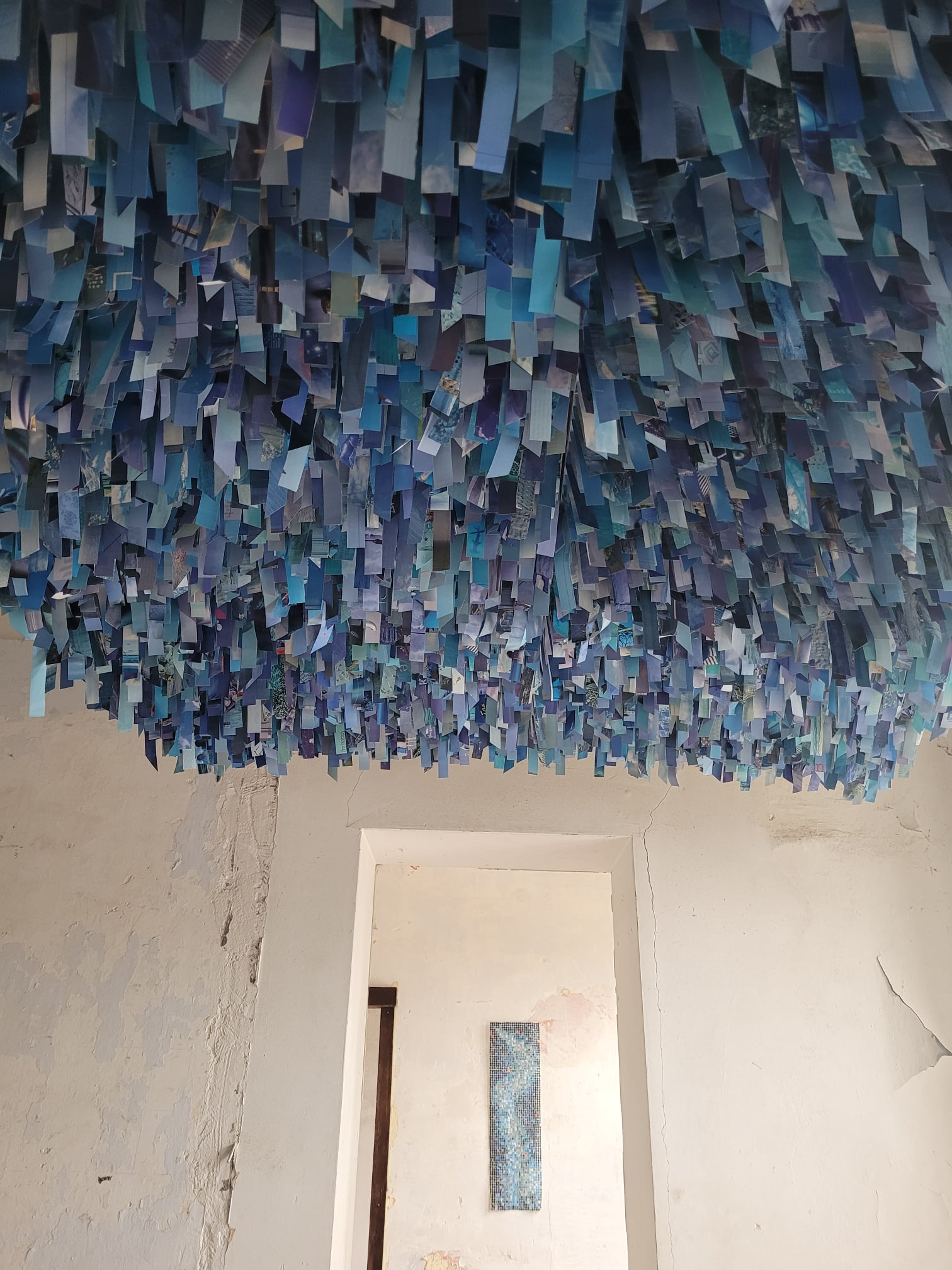 Cette artiste exploite, également, trois autres chambrettes, pour nous présenter son installation, nécessitant du recul, avec une huile sur toile, au loin, et, entre nous et cette oeuvre, une création suspendue, constituée de nombreuses languettes en papier, peintes en bleu.