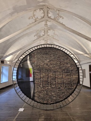 Aux premier et second étages, que ce soit dans l’anciene grande chambre des « mères supérieures », dans les chambrettes des moinesses ou dans une grande salle, nous découvrons les oeuvres des 22 invités du collectif « Vis-à-Vis », fondé par Bernard Boigelot, André Lambert, Philippe Luyten et Jacques Patris.