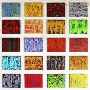 Outre deux autres artistes nous venant des Flandres, nous trouvons même, invité par Bernard Boigelot, un Autrichien, diplômé de l’ « Académie des Beaux-Arts de Vienne », vivant dans le Condroz, à Saint Severin, depuis 1994, Michael Kravagna (°Klagenfurt/1968), qui nous propose sa « Polyphonie », constituée de tableaux de différents formats, carrés, sa forme préférée, voire rectangulaires, gorgés de matières très diverses, incendiés de couleurs – très variées, d’une image à l’autre -, qui tranchent et s’éclatent.