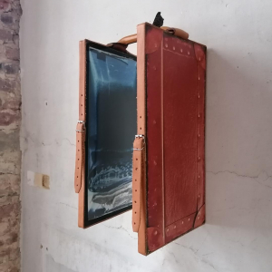 Exposant ensemble dans une autre chambrette, nous retrouvons les oeuvres de deux des fondateurs de « Vis-à-vis », André Lambert et Jacques Patris, prêts à voyager vers d’autres aventures artistiques, tous deux exposant, notamment, leurs valises, celle d’André étant peinte sur une toile, avec une poignée en cuir, alors que celle de Jacques, « L’Absente » (2012), est une création en 3D, garnie de photographies.