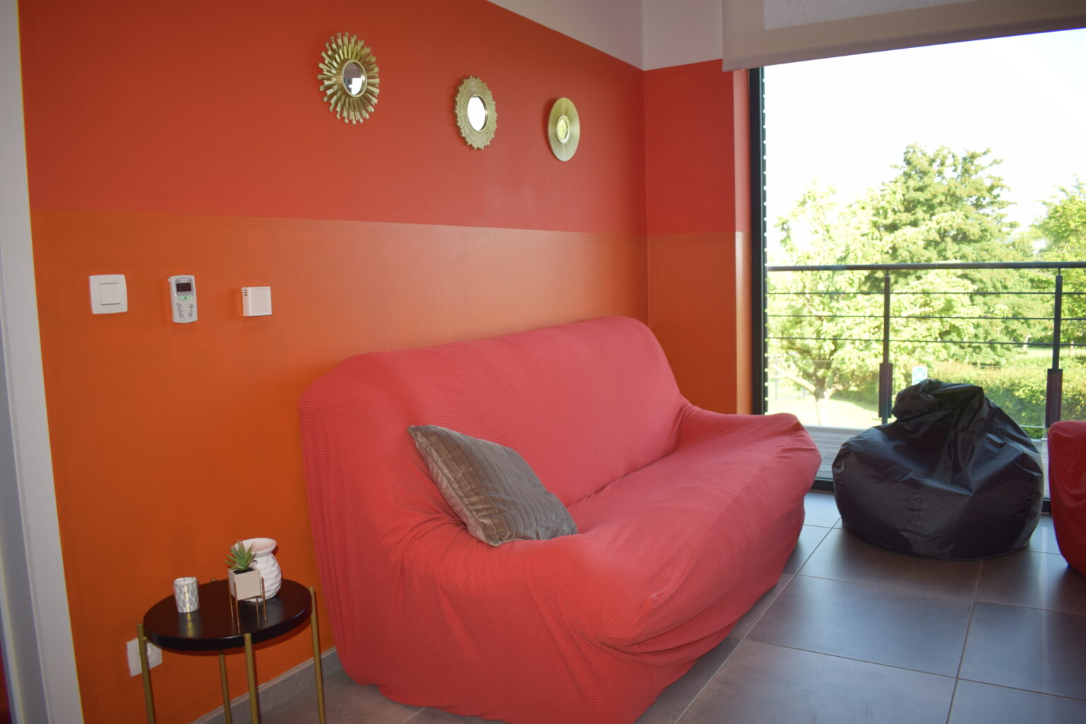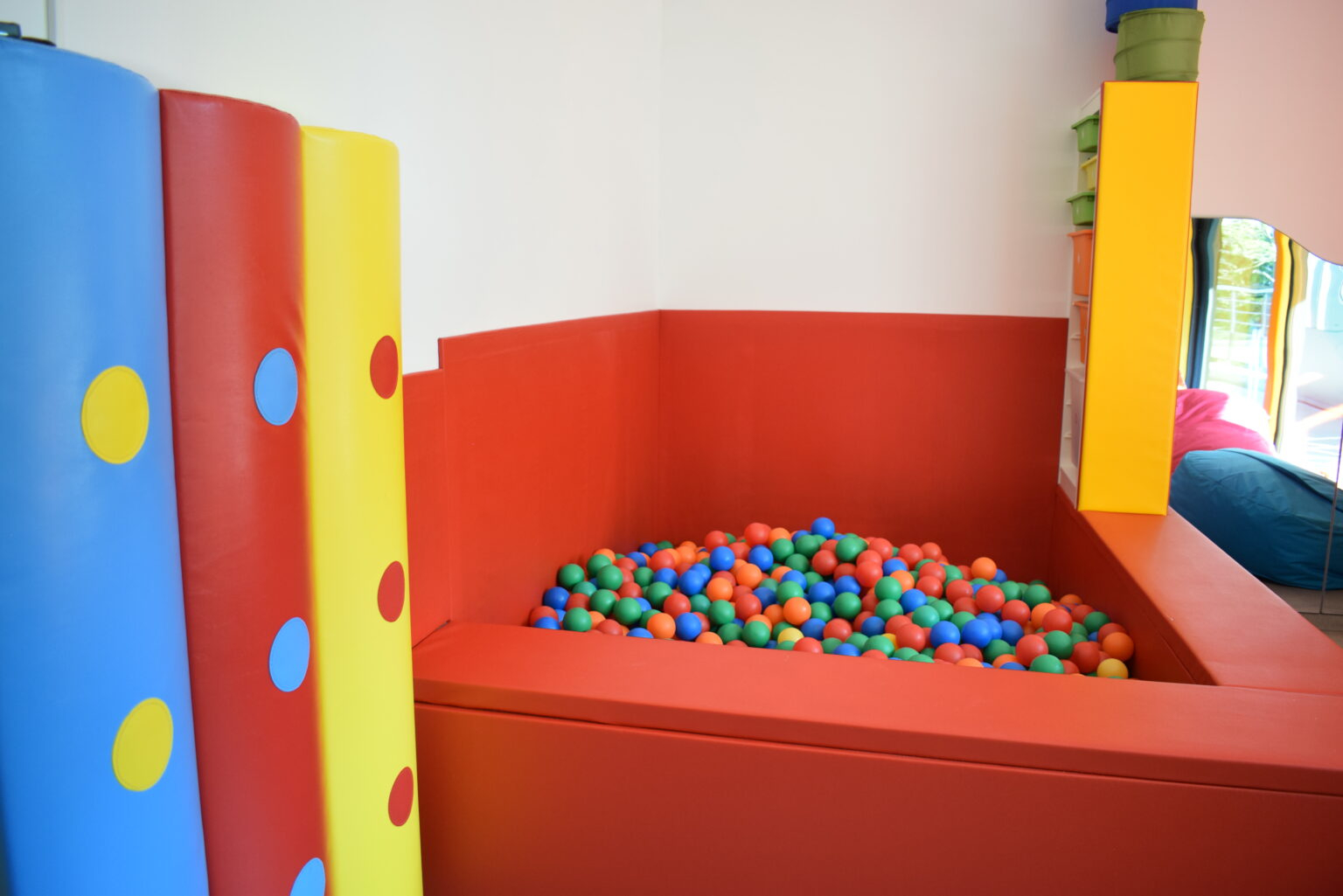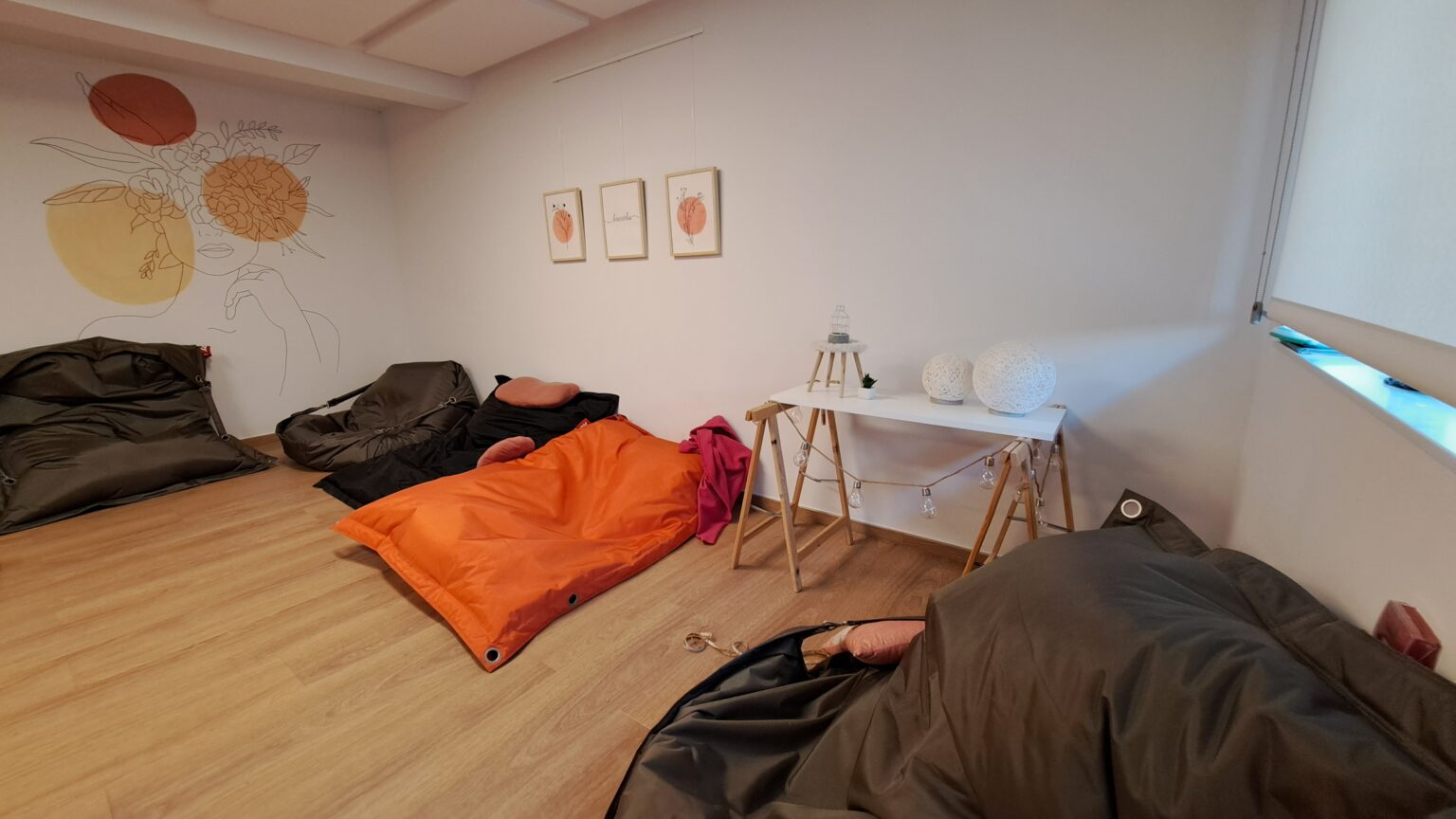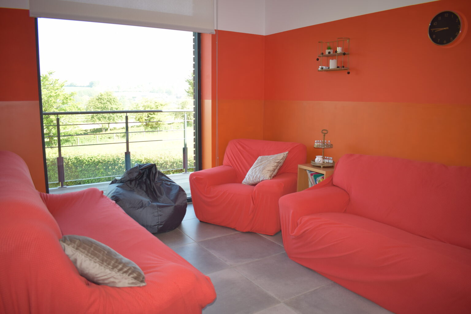 le petit salon orange sert de lieu de relaxation pour la lecture de contes et on y donne également des soins kiné.