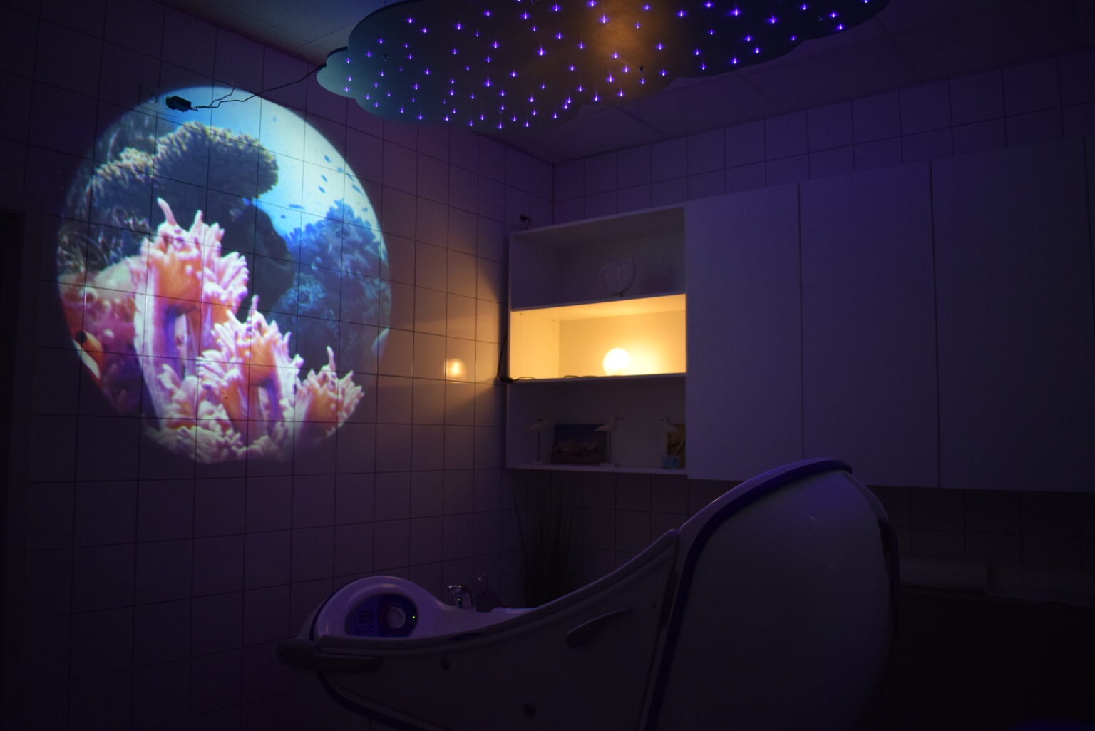 Le snoezelen se prolonge par une salle de bain totalement adaptée, équipée d’un système de projection et d’une sono et d’un espace de soin massage/pédicure.