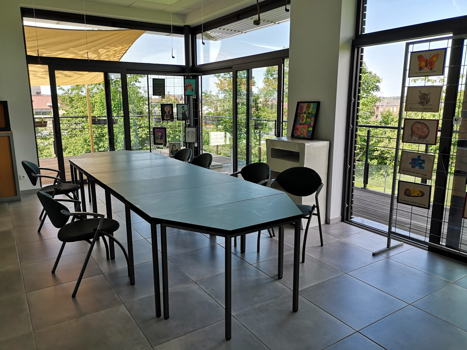 Une grande terrasse entoure ces espaces. Elle nous permet de profiter de la vue et est décorée chaque année par les plantations de fleurs réalisées par les bénéficiaires.