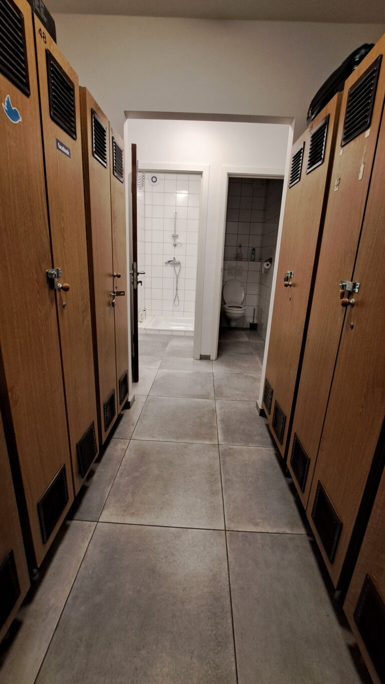 Dans la partie centrale du sous-sol, on retrouve, outre les locaux techniques et de rangement, les espaces réservés à l’équipe : vestiaires, toilettes, douches, une salle de réunion servant également de lieu d’accueil pour les familles et les visiteurs ainsi que le bureau de direction.