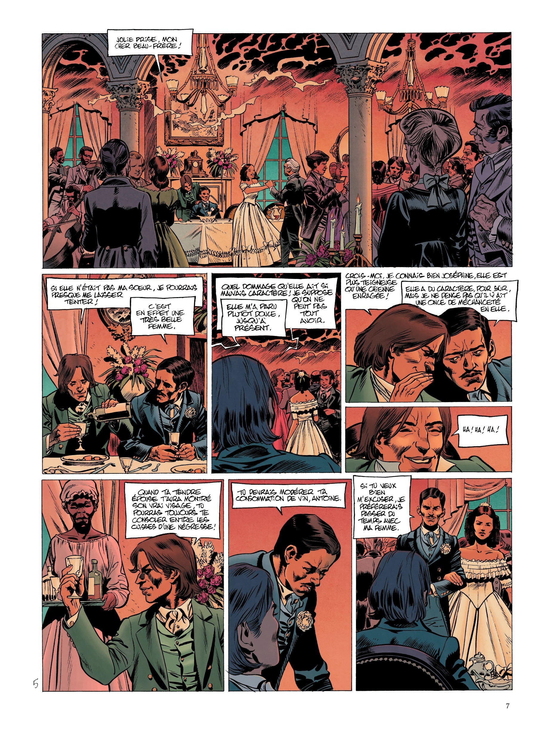 Dès la page 06 de l'album, à domicile, dans sa plantation, le jour de son mariage avec Georges, en 1822, Joséphine reçoit une amulette de fertilité de Marie Laveau, qui vient de la coiffer et qu'elle apprécie particulièrement, à la grande colère de sa mère, qui s'exclame : "Tous ces nègres... Ils nous veulent du mal ! Ils nous détestent tous !!"...