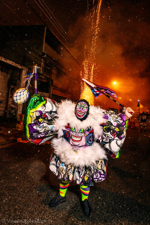 Leurs déguisements, hauts en couleurs, font l’objet d’une importante compétition entre les différents groupes. Elle représente un enjeu réel pour les chefs de bandes, qui investissent énormément d’argent, d’énergie et de temps à les concevoir.