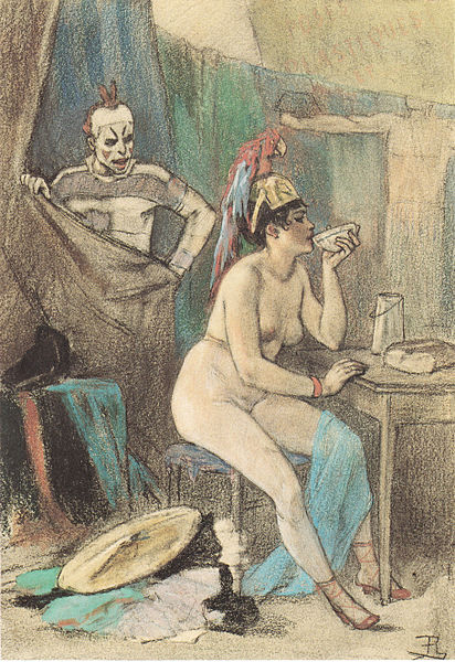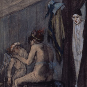 Un beau nombre d’oeuvres du XIXè siècle mettent en scène un clown, comme celles de Félicien Rops, issues de sa « Série des Cent légers Croquis », créée entre 1878 & 1881, dont le pastel, gouache, sur dessin à la pierre noire, « Vénus & Cupidon » ou « L’Amour bouché » (21,8 x 14,8 cm) et le pastel, crayon et aquarelle, « L’Entracte de Minerve » (22,5 x 15,5 cm).
