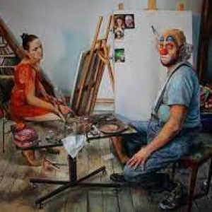 Ce personnage essentiel des spectacles circassiens se retrouve, également, dans des créations contemporaines, exposées dès la premère salle, dont une huile sur toile – faisant référence à « Vénus & Cupidon », de Félicien Rops -, exécutée à quatre mains par le couple franco-iranien Florence Obrecht & Axel Pahlavi, intitulée « L’Ecole des Enfants au Spectacle » (2022), qui nous proposent aussi, issues de leur collection, seize portraits de clown.nesse.s, huit duos de petites huiles sur paneau, reprises sour le simple titre de « Diptyque » (2016/30 x 24 cm, pour chaque oeuvre) ou encore, d’un tout autre format, une huile sur toile nous présentant un clown posant pour une peintre, « Quand nos Secrets n’auront plus Court » (2018/160 x 210 cm).