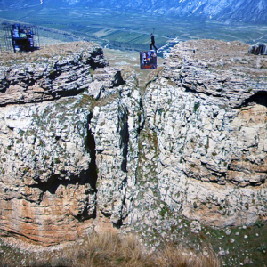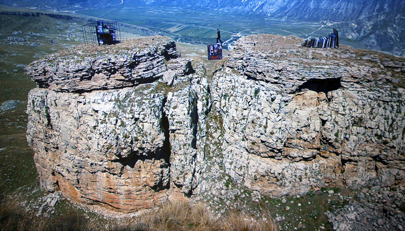 Autre vidéo, « Tightrope » (58’10/2015), de l’artiste féminine russe Taus Makhacheva (°Moscou/198), qui nous montre comment, en Russie, surplombant une spectaculaire vallée, le funambule Asul Abakarov, sur une corde tendue entre deux pans rapprochés d’une montagne, a pu transporté, d’un côté à l’autre, quelques 61 copies de tableaux, du « Musée des Beaux-Arts du Daghestan ».