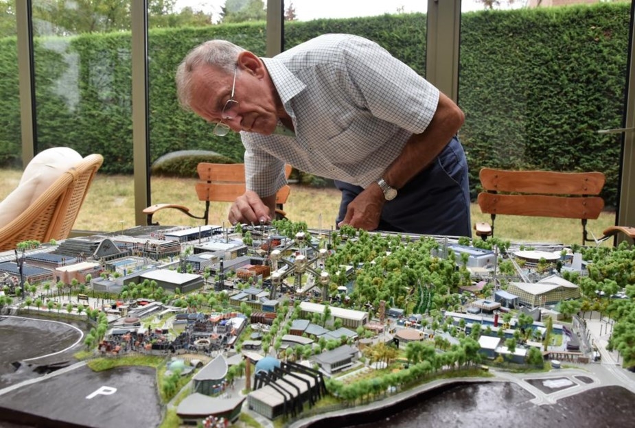 "Pendant trois ans, j'ai recherché l' 'Atomium', d'une hauteur réelle de 102 m, qui, à l'échelle 1/1250è, est haut de 8 cm, 0,8 m/m sur la maquette représentant 1 m dans la réalité. L'ayant trouvé, j'ai pu commencer le travail, qui dura environ 1.700 heures, réparties sur 3 ans. J'aurais voulu qu'elle soit terminée pour les 60 ans de l'atomium, en 2018, mais c'était totalement impossible, tout ayant été fidèlement reproduit, sauf les chaises et tables des terrasses de restaurants, ainsi que les heut parleurs cylindriques, fixés sur trois petits pieds métalliques."
