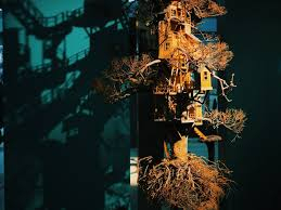 Outre un extrait du film « Avatar » (James Cameron/USA/2009/162′), évoquant la relation spirituelle qu’entretient le peuple Na’vi avec son environnement, dans la seconde section, nous découvrons « Depuis la Terre jusqu’au Ciel » (2014), une oeuvre en bois de Gilles Barbier (°1965) – artiste français, qui, né en Mélanésie, vit désormais à Marseille -, nous montrant des maisons poussant dans les arbres, un rêve où l’homme et la nature se retrouveraient en symbiose, vivant en harmonie.