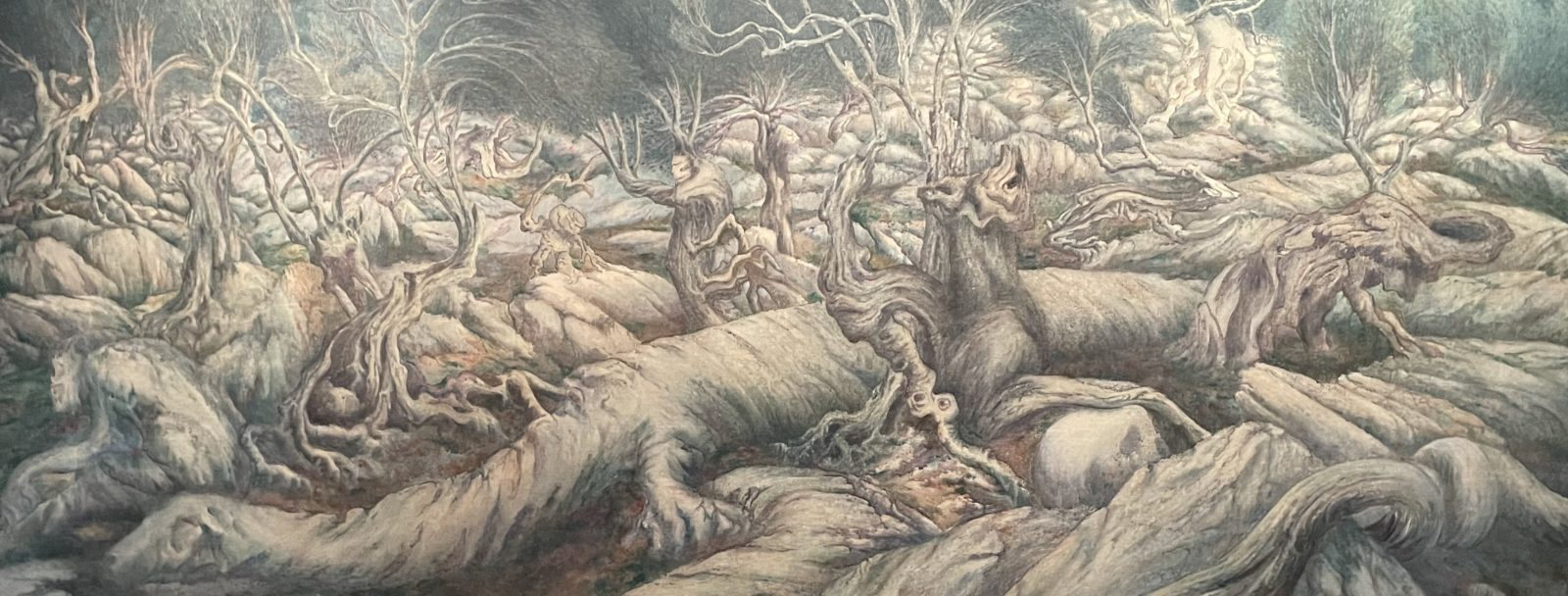 Autre forêt troublante, celle de l’artiste belge William Degouve De Nuncques (1867-1935), qui, avec son huile sur toile « La Forêt mysérieuse » (1900), nous dévoile des créatures rampantes et menaçantes, êtres biomorphiques se situant entre le racinaire et l’animal.