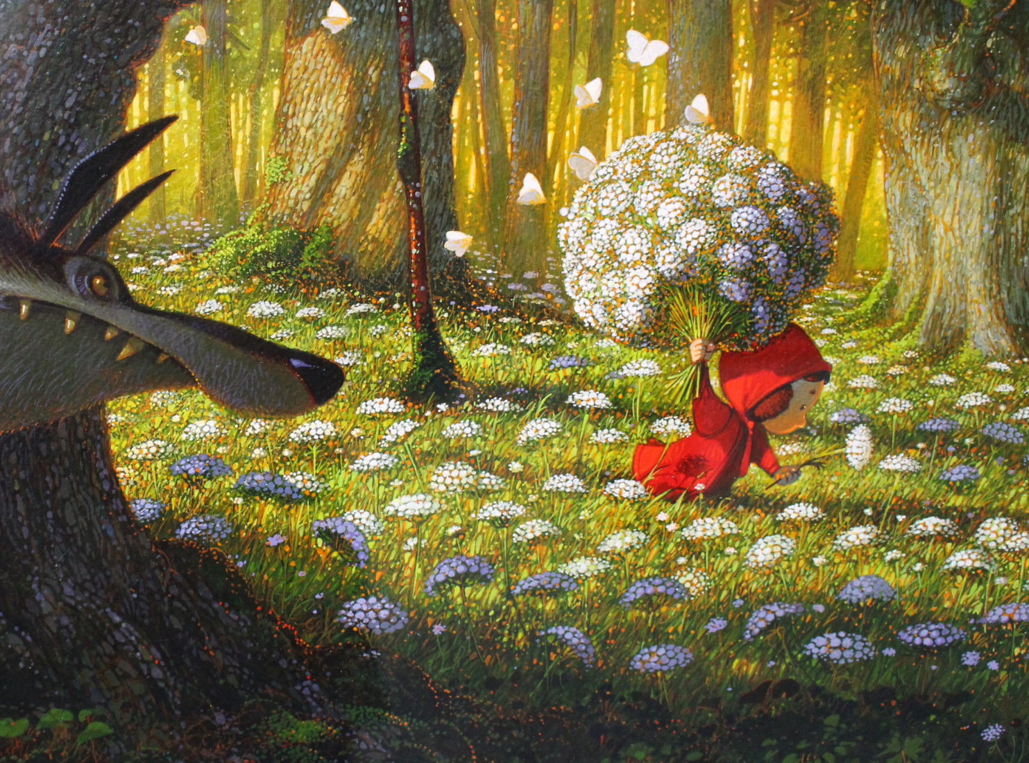 Ces enchantements raviront nos enfants, qui, sur un grand écran, assisteront à la projection de dessins animés, tout en ayant pu voir des illustrations d’un autre artiste français, contemporain quant à lui, Frédéric Pillot (°1967), diplômé de l’ « École supérieure des Arts décoratifs », à Strabourg, nous emmenant dans une forêt verdoyante et fantastique, où la faune et la faune se côtoient en toute harmonie, comme dans « Blanche Neige » (2021) ou « Le Petit Chaperon Rouge » (2021).