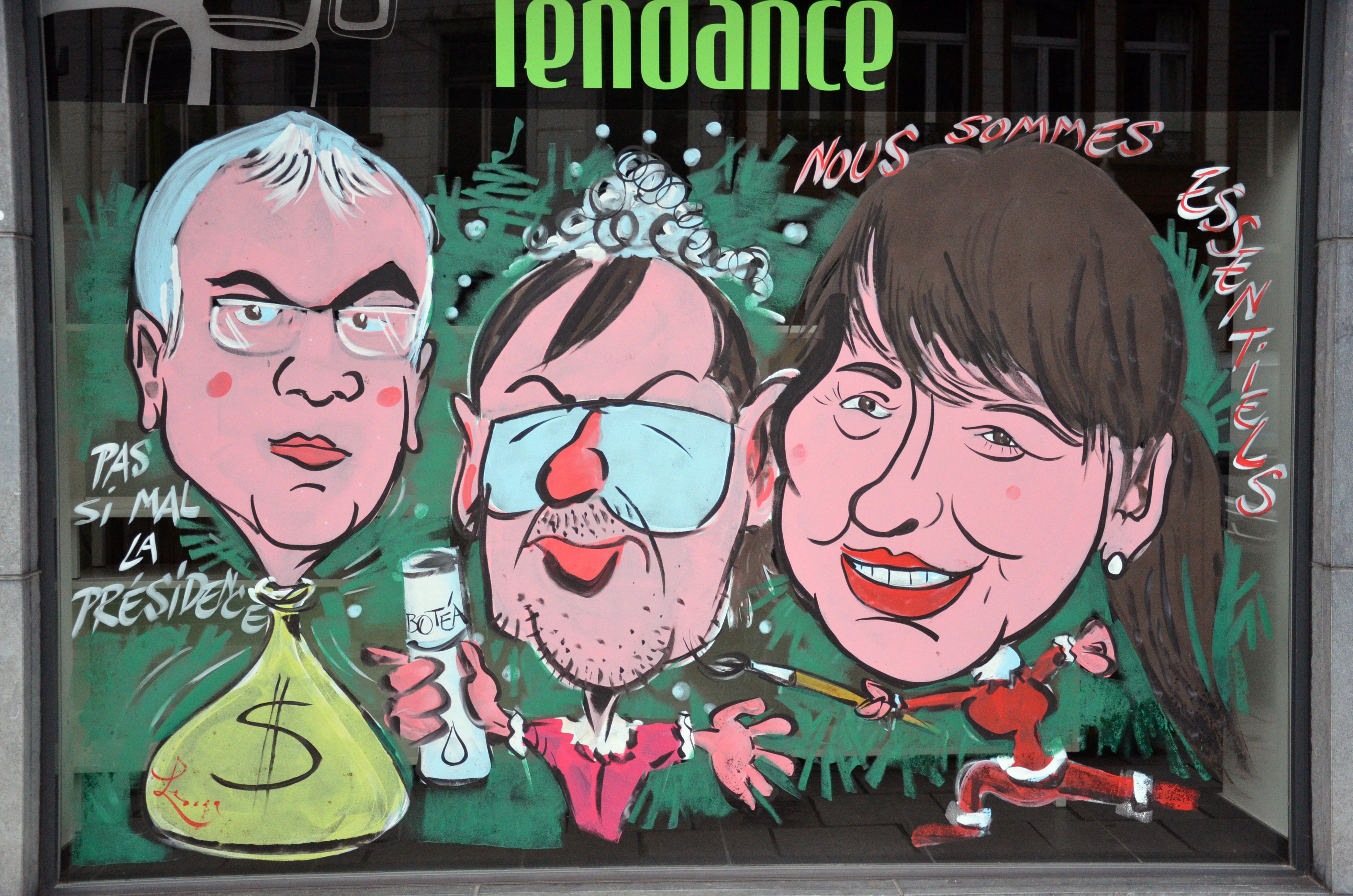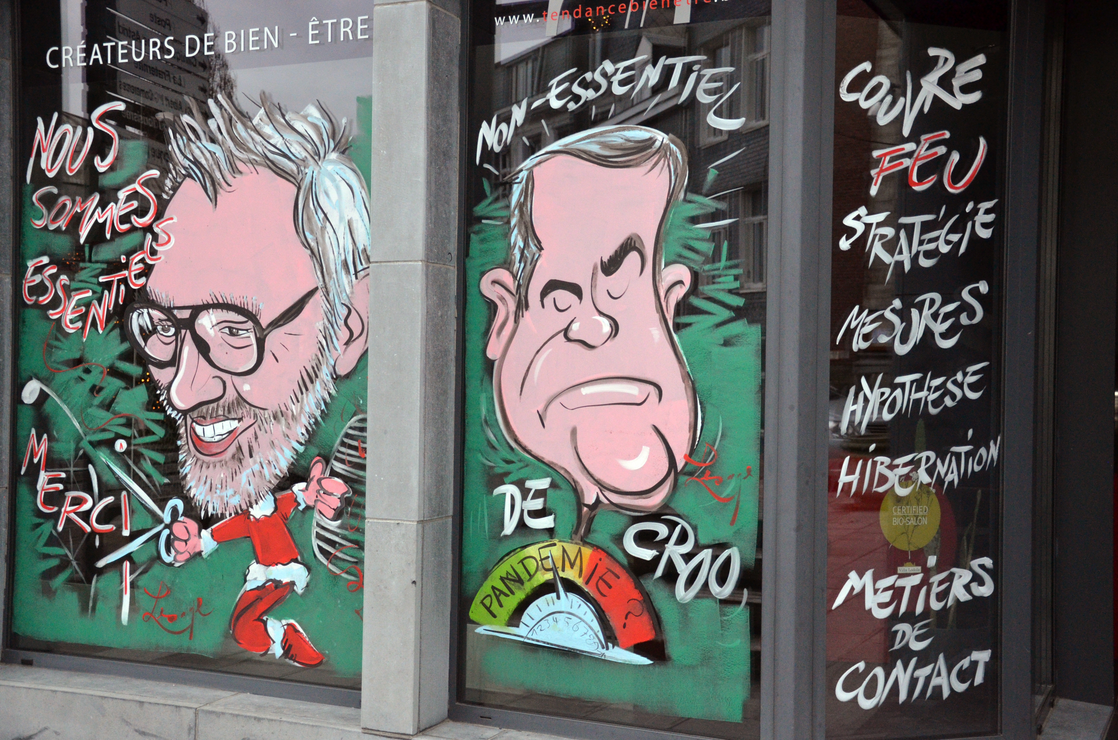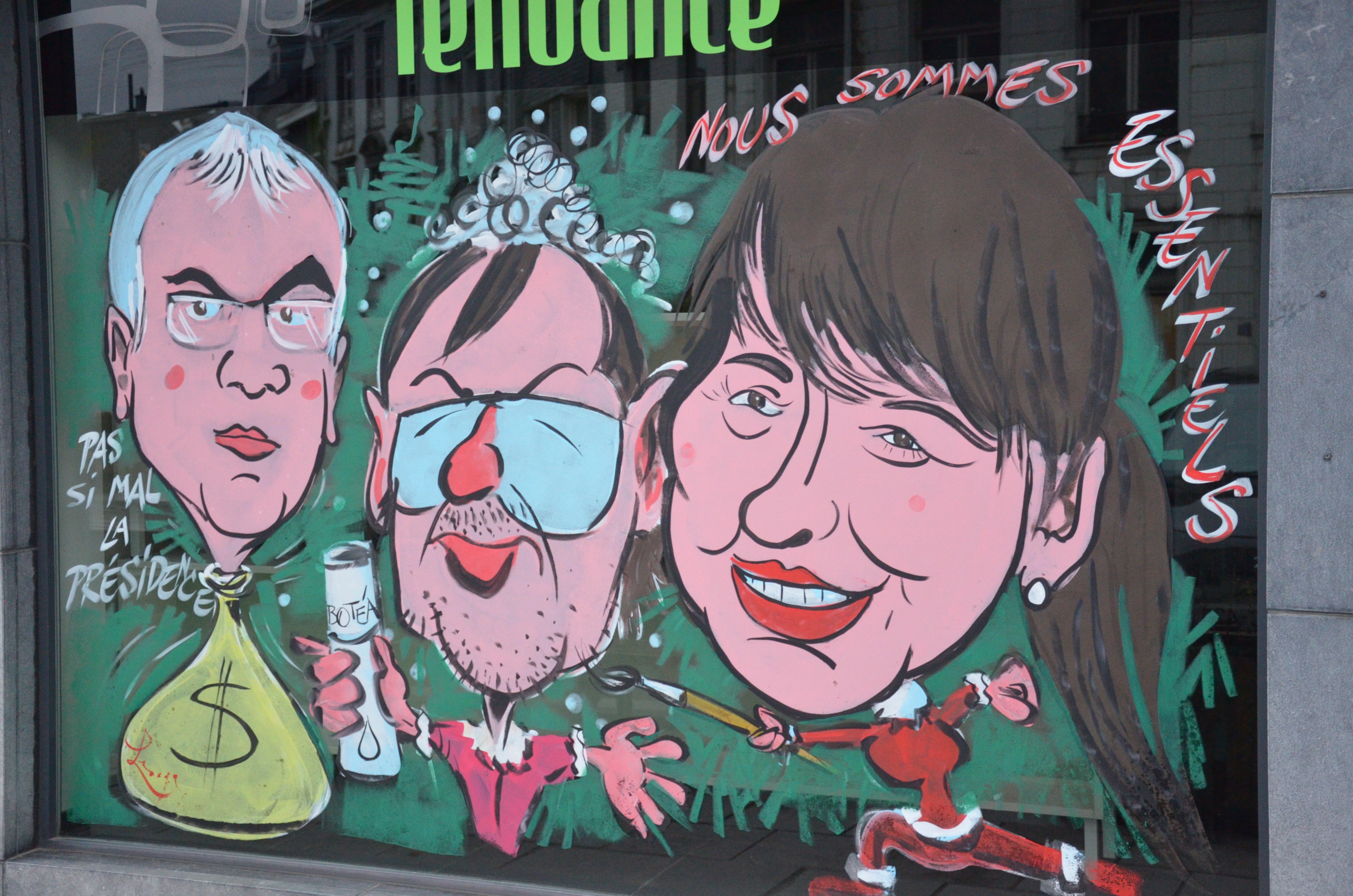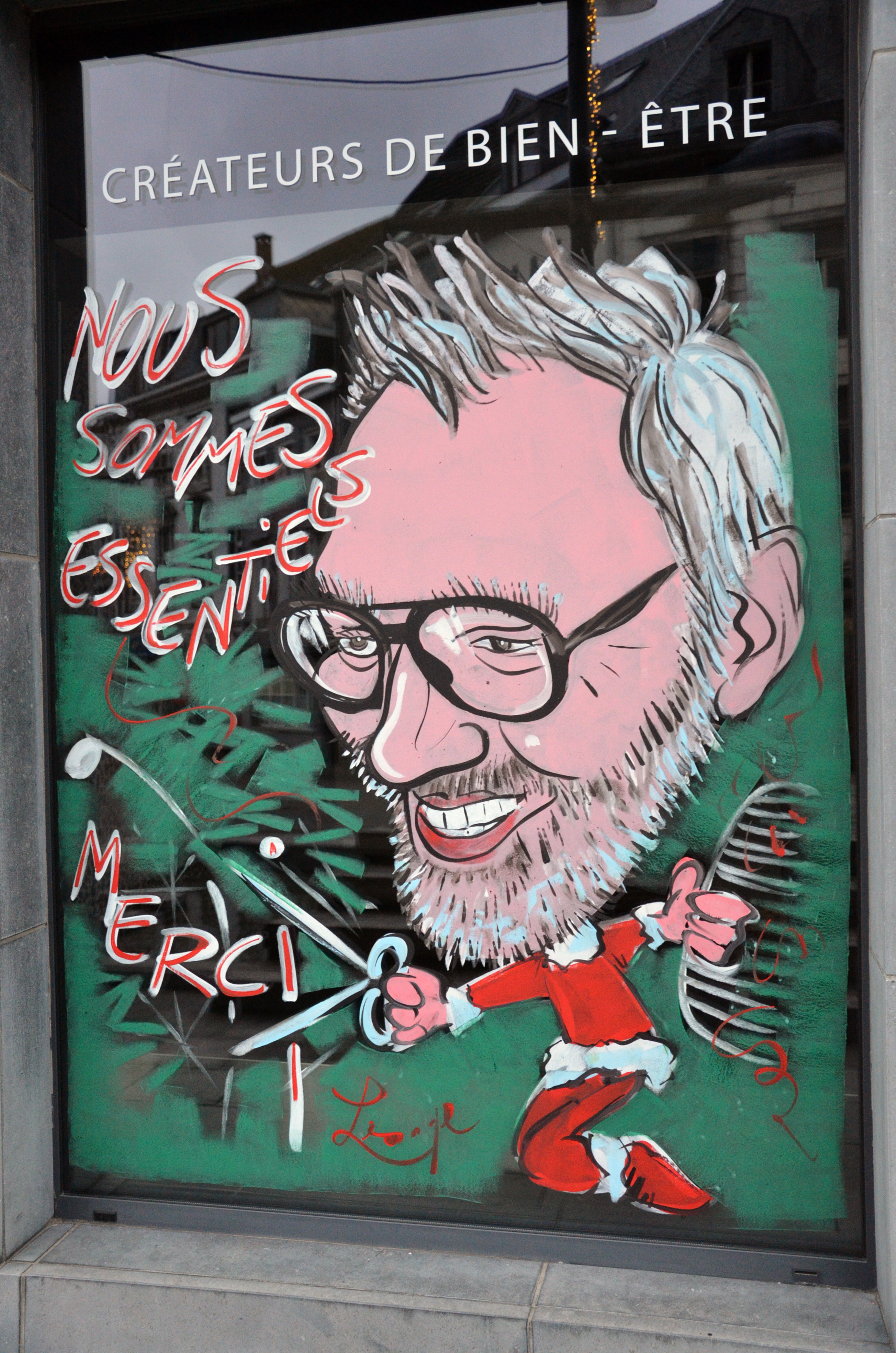 Au salon de bien-être et de coiffure Tendance à Malmedy, les patrons ont toutefois décidé d’apporter une touche d'humour et d’originalité à leur commerce en faisant peindre des caricatures de nos politiques sur toute la longueur de leurs vitrines. Ils souhaitent ainsi manifester leur soutien envers tous les commerçants.