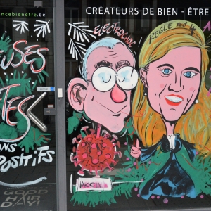 Exit les bonhommes de neige et Père Noël! Cette fois, c’est Pierre-Yves Jeholet, Franck Vandebroucke, Annelies Verlinden, Alexander De Croo ou encore Elio Di Rupo qui habillent la devanture. On y retrouve même le virologue Yves Van Laethem. «C’est mon épouse qui a l’idée des caricatures. On n’avait pas envie de faire passer un message négatif, puisqu’on fait part de nos bons vœux, mais on voulait quand même imager notre détresse.» Serge Metzmacher et sa femme, Carole Stabel, figurent d’ailleurs aussi sur cette fresque, réalisée par le peintre de Houffalize, Jean-Marie Lesage. Cela fait 50 ans que l’artiste exerce ce métier, particulièrement demandé de la mi-novembre à la mi-décembre.