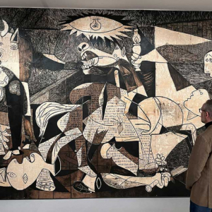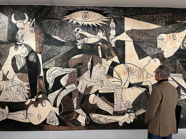 Inspirée du chef d’oeuvre « Guernica » (1937) de Pablo Picasso, la galerie belgo-luxembourgeoise « Nosbaum Reding » (stand 126) nous propose de découvrir une oeuvre monumentale, en bois gravé et encre, de 243 x 776 cm, de l’artiste de Lille, Damien Roubaix : « Garage days re-re-visited » (1972).