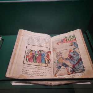 A noter l’importance de la religion, force unificatrice, qui conduisit au développement du dialecte géorgien en une langue officielle distincte. Des exemples de son alphabet unique apparaissent dans des textes écrits dans des manuscrits et sur la pierre, ce qui nous est présenté au « Musée Art & Histoire ».