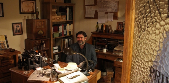 Au « CBBD », après avoir évoqué les débuts de Juanjo Guarnido, avec quelques dessins d’époque, grâce à la scénographie de Jean Serneels, sous la coordination de la commissaire, auteure des textes de l’expo, Mélanie Andrieu, nous découvrons une superbe reproduction, à l’échelle 1/1, du bureau de « John Blacksad », dans lequel nous ne pouvons pénétrer, hormis le dessinateur lui-même (cfr. photo). Avec les anciens téléphone, machine à écrire mécanique et poste de radio des années ’50, nous remontons le temps, avec réalisme, jusqu’aux années '50.