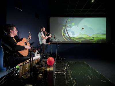 14h30 : les familles auront droit à un moment privilégié pour les enfants, recommandé à partir de 4 ans : un Ciné-Concert (48') des "Grignoux", au "Caméo", animé par deux musiciens, Rémi Decker (guitare, kick valise & bruitage) et Adrien Lambinet (synthé & trombone).