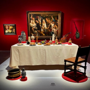 Au moment de quitter, avec regrets, ces « Fêtes et Célébrations flamandes, Brueghel, Rubens, Jordaens, … », une huile sur bois, « Nature morte aux Crêpes, Gaufres et Cougnole », attribuée à Hans Francken (1581-1624) nous met en appétit, de même qu’un dernier élément d’une scénographie particulièrement bien réussie : une authentique table, montée comme elle devait l’être du XVIIe siècle.