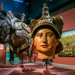 Soulignons la présence de deux têtes de géants, en papier mâché, bois, métal & cheveux, d »une hauteur d’1m84, celles de Pallas Athena (1765-1766), d’après Daniel Herreyns (?-1809) et de Druon Antigone (1534-1535), d’après Pieter Coecke van Aelst (1502-1550), un géant que nous retrouvons dans l’huile sur toile « Fête traditionnelle à Anvers avec le Géant Druon Antigon » (1697), du peintre anversois Alexander van Bredael (1663-1720).