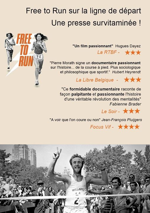 Etant sorti en salles, en avril 2016, « Free to Run »  (Pierre Morath/Sui.-Fra.-Bel./2016/99′), ce très intéressant reportagedistribué dans une vingtaine de pays, fut programmé au « Cinéma Aventure » et au « Cinéma Vendôme », à Bruxelles, n’étant présenté, le plus souvent, qu’en projection unique événementielle, comme à Liège, le 20 mai 2016, au « Sauvenière », ou à Namur, au « Caméo », le 24 mai 2016, dans ce dernier cas, suivie d’un débatanimé par Gilles Goetghebuerrédacteur en chef de la revue « Zatopek », avec la participation de Julie Minetjoggeuse amateureaffiliée au « Running Club Namur », et de Roger Igo, ayant entraîné au « SMAC »-Namur, avant de devenir entraîneur fédéral  de demi-fond et coach de courses de montagne, une spécialité dont il fut, en 2010, champion d’Europe