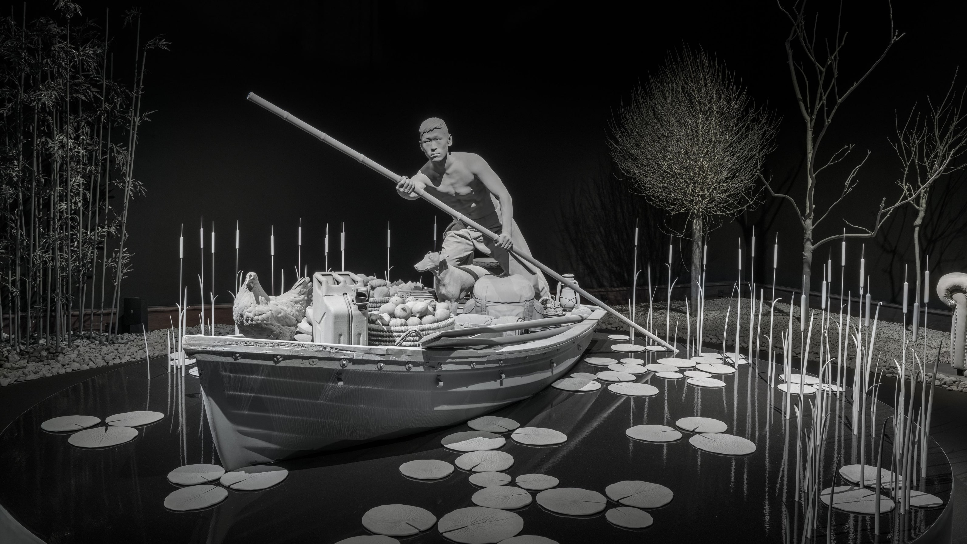 Un tout autre univers nous est ensuite proposé, avec un impressionnant et énergique « Batelier » (2020), pagayant torse nu sur la représentation d’une surface d’eau, agrémentée de feuilles de nénuphars, sa barque emmenant un chien, un poulet, un jerrycan et de nombreux fruits, vraisemblablement destinés à la vente. Cet homme évoquerait-il, également, un sans abri solitaire ou un commerçant se rendant sur l’un de ces marchés flottants matinaux, si populaires dans différents pays d’Asie ?