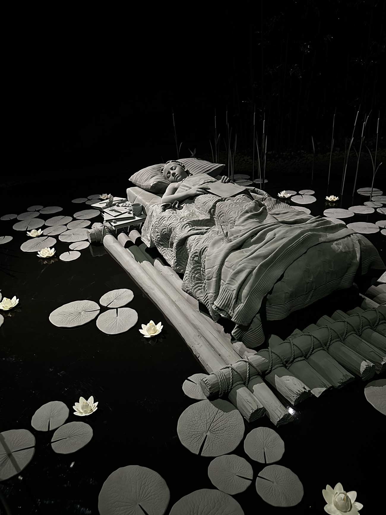 Trône au centre de l’avant-dernière salles de sculptures, « Mon lit-radeau, la chambre-mer, j’ai ris d’une certaine tristesse en moi » (2010), une installation représentant une étendue d’eau, avec ses nénuphars et autres plantations , avec un lit sur lequel une jeune-fille est endormie, un livre tombant de ses mains, sa table de chevet portant un carnet de notes, un crayon, un verre et une plaquette de pilules, deux papillons enjolivant cette scénographie.