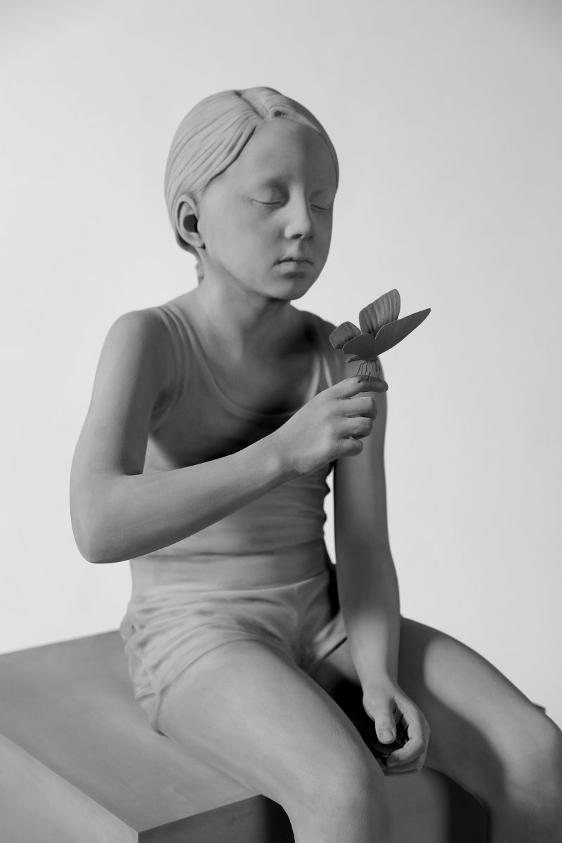 A peine entrés que nous sommes accueillis par « Tatiana (Bulle de Savon) » (2017), une charmante petite fille, en grandeur nature, concentrée, les yeux fermés, au moment précis où elle souffle une bulle de savon, façonnée en verre, de petites bulles suspendues dans l’air complétant la scénographie, aussi agrémentée d’un « cerisier du Japon » sculpté (2019), à la fois noueux et empreint d’une aura féerique, ses fleurs étant créées d’un rose tendre.