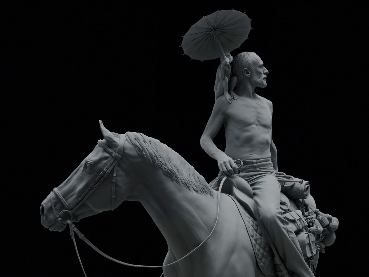 Une seconde salle nous propose « Le Cavalier » (2020), impressionnant, également en grandeur nature, comme la plupart des personnages créés par Hans Op de Beeck. Sur son épaule, un petit singe tient un parasol, destine à protéger ca cavalier du soleil, divers objets (outils, sac de couchage, trompette, …) se trouvant sur les flancs du cheval. Cet énigmatique voyageur solitaire évoquerait-il un actuel migrant ?