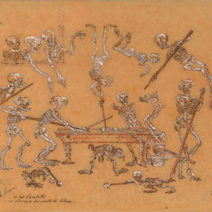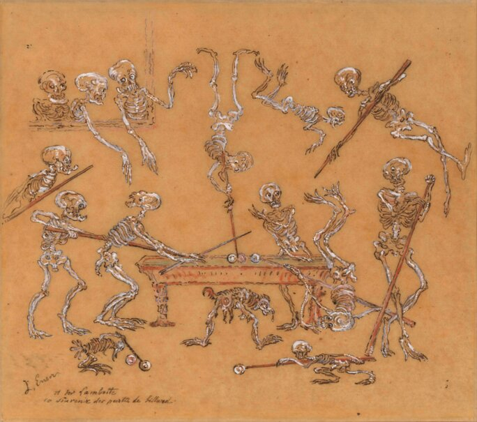 Venant d’évoquer la présence de squelettes dans nombre d’oeuvres de l’artiste ostendais, notons que c’est dans son huile sur toile « Squelette regardant des Chinoiseries » (1885) qu’un premier squelette fut peint par James Ensor.
