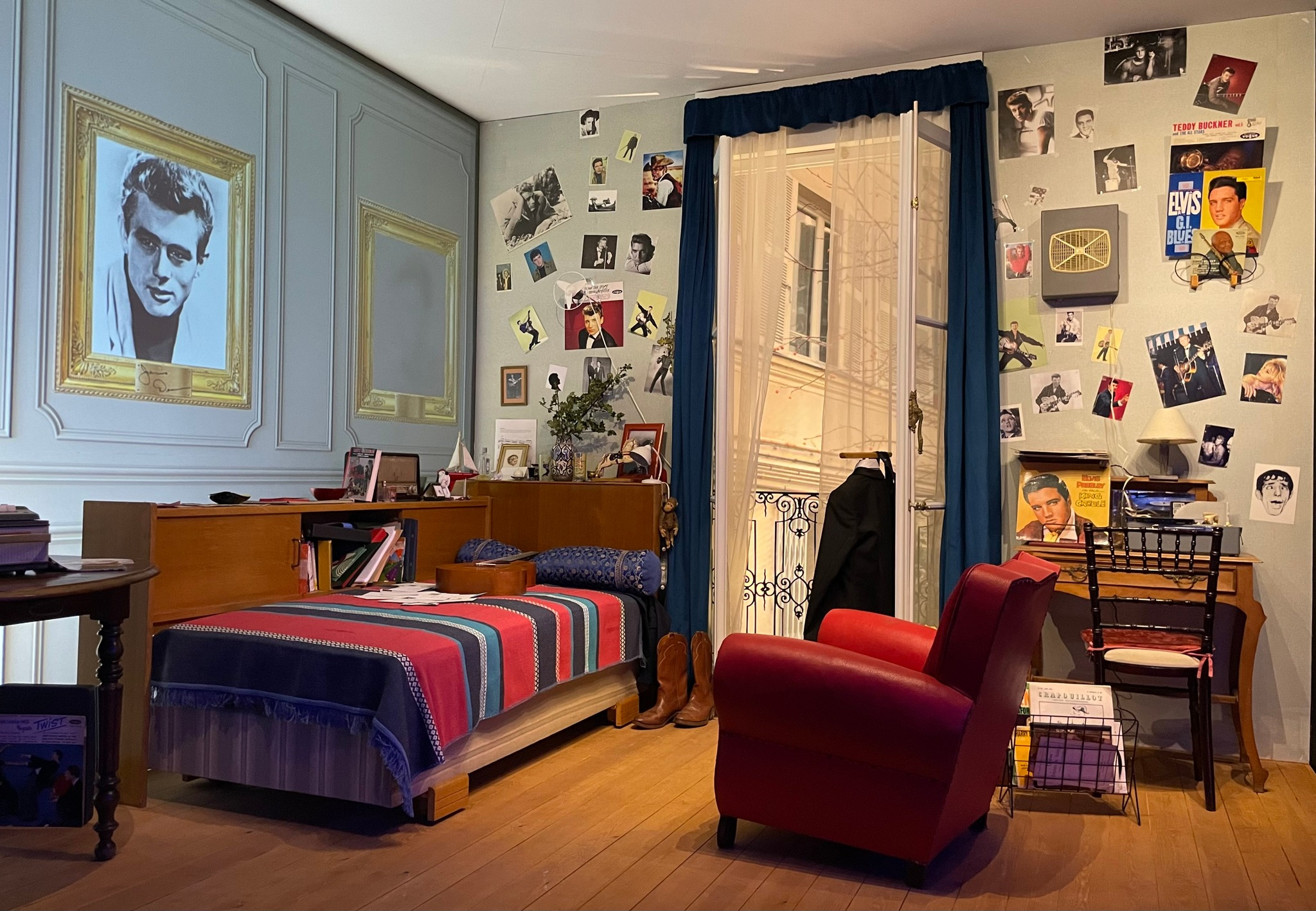 Arrivés dans l'espace principal, nous abordons le thème de la "Rue", avec une reproduction proche de l'identique de la chambre à coucher qu'il habitat à Paris, à ses débuts, avec une fenêtre ouverte donnant sur une photographie, échelle 1/1, de ce qu'il voyait de sa chambre, elle-même garnie d'objets représentatifs de l'époque, tels un tourne-disques, des pochettes de vinyles d'Elvis Presley (1935-1977), qu'il admirait, et autres.