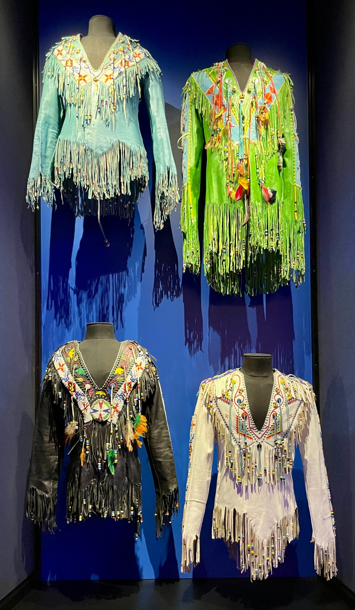 Plus loin, nous découvrons le thème de l' "Amérique", quelques-uns de ses blousons, casques de motard, chapeaux, bottes, foulards, ... étant exposés à quelques mètres de trois motos "Harley Davidson" et d'une voiture "Cobra", arrivées au sein de l'exposition, moins de trois heures avant l'ouverture officielle, le lundi 19 décembre.