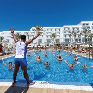 La zone extérieure de l’hôtel, qui descend jusqu’à la mer avec plusieurs niveaux de terrasses, possède plusieurs solariums et six nouvelles piscines, dont une exclusivement pour les adultes, une autre à débordement avec hamacs aquatiques, et deux pour les enfants, une avec des jeux et l’autre pour les bébés, toutes deux réunies dans une enceinte clôturée et proche du Club RiuLand. Un nouveau bar de plage a été construit à proximité des piscines pour adultes, qui comptent également une zone Riu-Fit destinée aux activités sportives, offre complétée par une piste multisport et un espace de beach-volley.