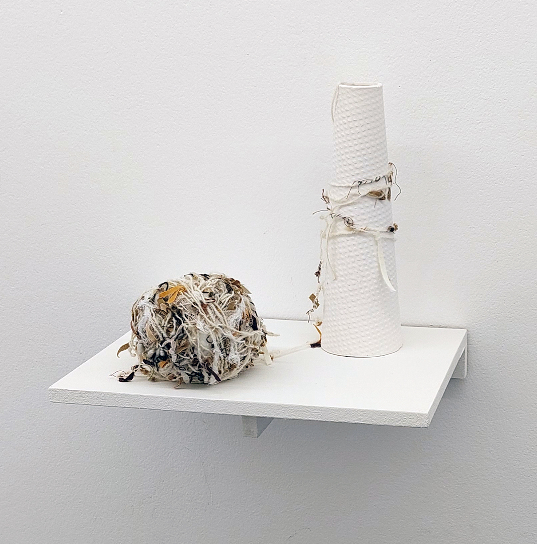 Sur le mur voisin, est présenté un grand cercle de dentelle, associant de manière aléatoire les déchets de fils. Dans le couloir reliant les deux salles, l’oeuvre ‘Fantaisie’ (2021) est une pelote de laine filée au rouet toujours à partir de ces mêmes déchets de fils, témoignage du temps qui passe.