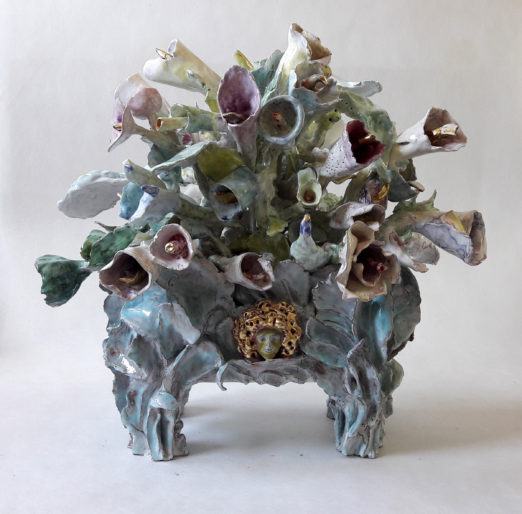A proximité immédiate de ces cabines de bain, la céramiste française Odile Levigoureux (°Paris/1945) nous présente « Les Fruits de la Terre », une invitation à la découverte de trois aspects d’un œuvre exubérant, hypnotique, multiple, dominé par le végétal, qui témoigne du goût de l’artiste pour l’art baroque.