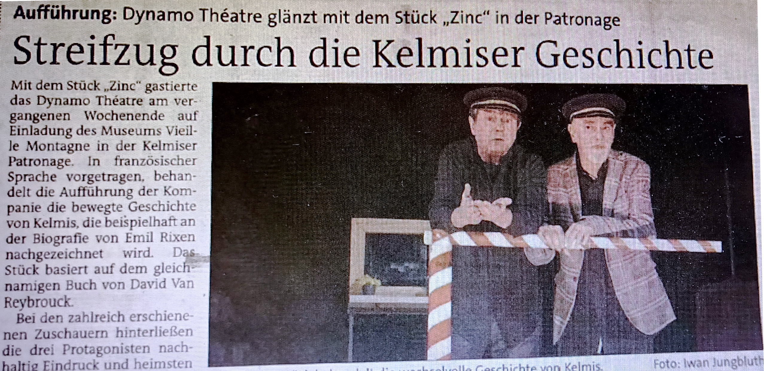 Le 17 mai : ZINC, une superbe pièce retraçant un épisode de la minuscule localité de Neu - Moresnet où habitait des membres de la famille Rixen, un nom très connu dans la région malmédienne.