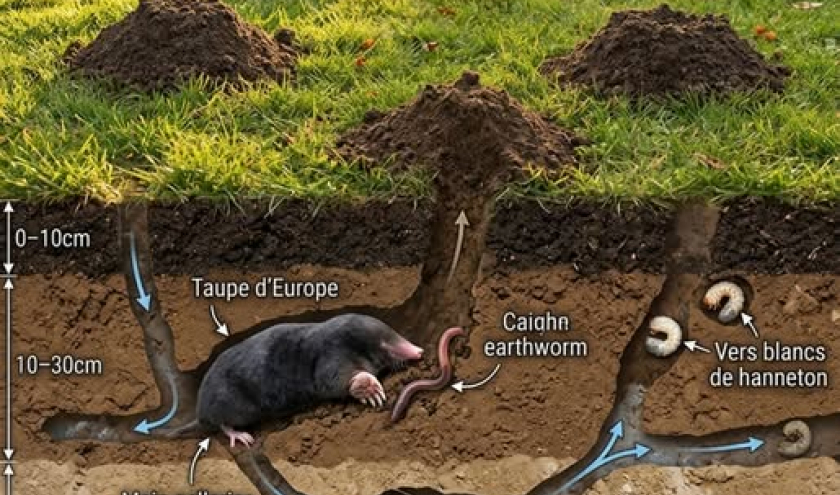 La taupe chasse ces trois ravageurs à longueur de jour et de nuit. Elle patrouille ses galeries en continu — un circuit complet toutes les quatre à cinq heures — et capture tout ce qui tombe dans le réseau ou qui s'y déplace. Un sol avec une taupe résidente a cinq à dix fois moins de vers blancs et de larves de tipule qu'un sol sans taupe — la différence est visible sur le gazon (moins de plaques mortes) et au potager (moins de collets sectionnés).