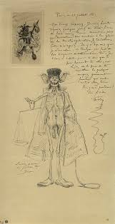 Soulignant la présence, comme James Ensor (1860-1949) le fit, de nombreux squelettes dans les oeuvres de Félicien Rops, notons ce qu'André Guyaux, écrit dans le catalogue (p.88) :" Dans la lettre à Malassis, de Juin 1864, sous le couvert de ses affinités avec Baudelaire, Rops glissait une étrange définition du squelette : 'Baudelaire est, je crois, l'homme dont je désire le plus vivement faire la connaissance, nous nous sommes rencontrés dans un amour étrange, l'amour de la forme cristallographique première : la passion du squelette'. "