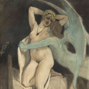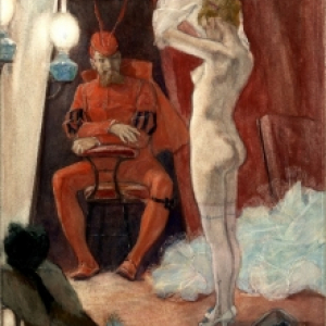 Entre 1878 et 1882, Félicien Rops (1833-1898) travaille avec passion sur des dessins, qui comptent aujourd'hui parmi ses chefs-d'œuvre, dont la célèbre "Pornocratès" (1878), exposée au sein de la collection permanente, différents projets figurant dans l'exposition. A son sujet, il écrit, en 1879, à l'écrivain belge Edmond Picard (1836-1924) : "Voici : sur une frise antique, une grande femme, nue comme toutes les vérités, les yeux bandés, gantée de noir, chaussée de grands bas de soie, coiffée d'un Gainsborough, se laisse guider par un cochon, à queue d'or."
