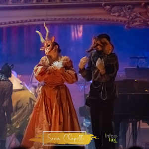 Quelques 130 costumes, certains dignes du célèbre Carnaval de Venise, sont portés par nombre de comédiens, accompagnés par dix musiciens de l’ « OPRL », Luc Petit ayant déclaré les concernant : « L’idéal dans un tel spectacle serait d’avoir une adéquation parfaite entre musiciens, acteurs et danseurs. Je suis ravi de faire participer les musiciens qui acceptent de s’amuser et de se mettre en scène. Je ne peux pas ne voir en eux que des instrumentistes assis sur une chaise … »