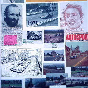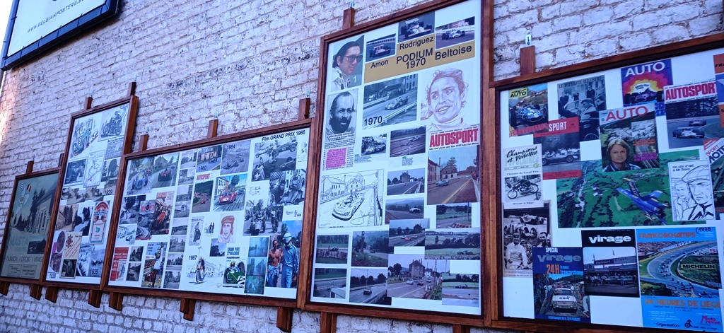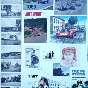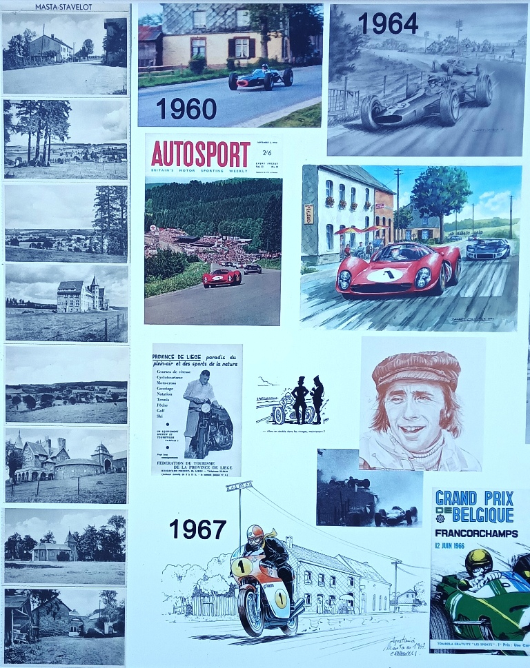 Sur plusieurs mètres de panneaux, il a rassemblé ses documents, avec en fil conducteur, la maison familiale. "La première photo montre la maison alors qu’il n’y avait pas encore le circuit, dans les années 1900. Après on voit l’évolution du lieu, l’évolution du circuit, les premières courses, avec les motos d’abord. Il y a une photo de 1929, une de 1932 et on avance comme ça progressivement, jusqu’en 78." Lorsqu’il imagine l’exposition, Vincent Gaspar se rend compte que toutes les époques ne sont pas représentées sur les panneaux. Il décide alors de faire faire quelques illustrations par des dessinateurs professionnels, par Benoit Deliège et Christian Papazoglakis par exemple.