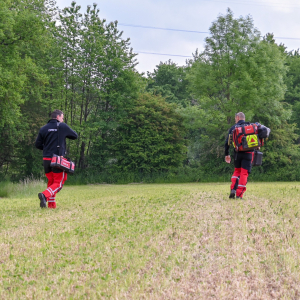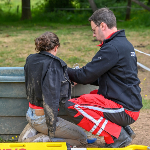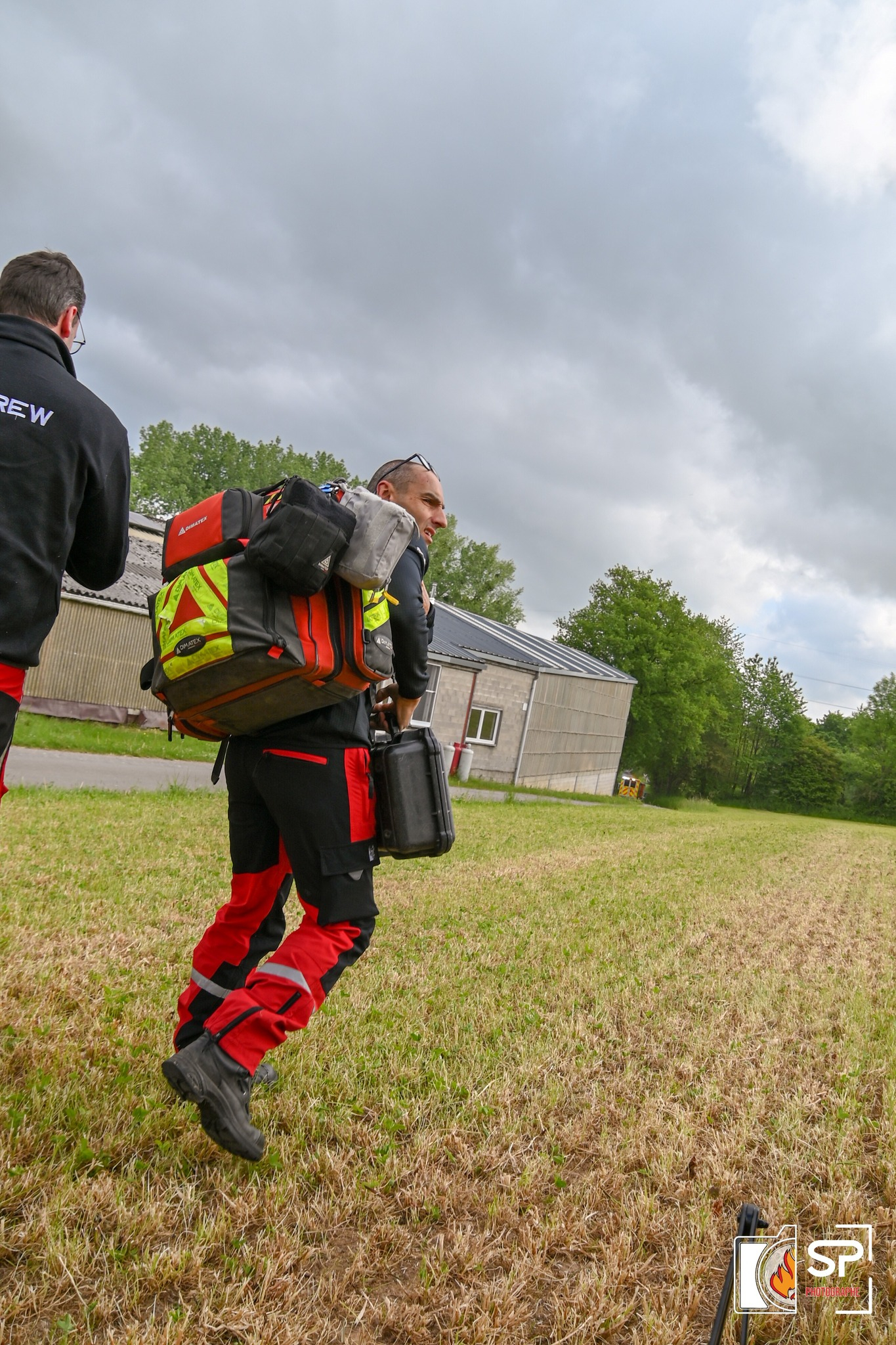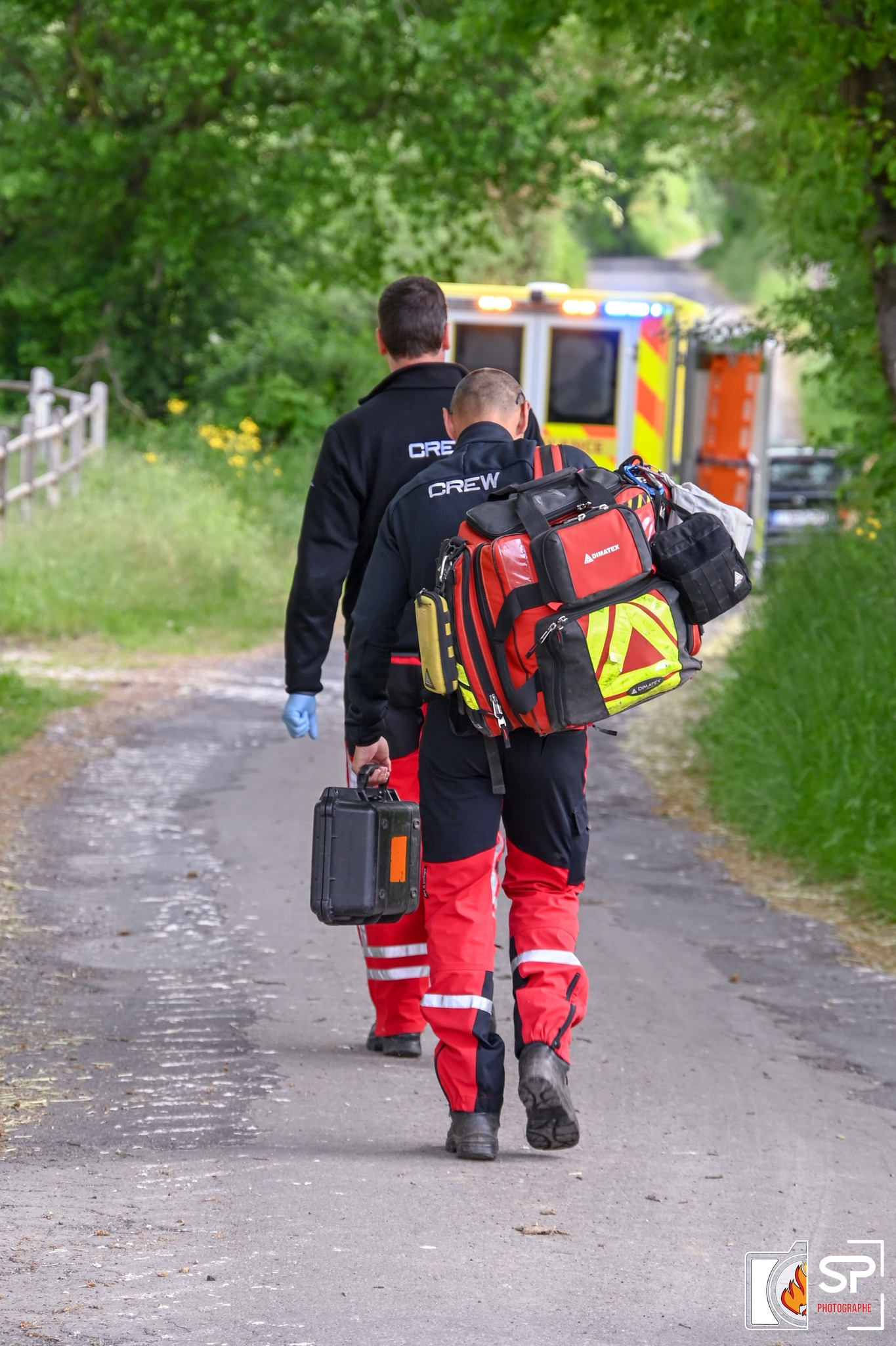 Antoine met en route et le reste de l'équipe arrive, direction la zone de secours hemeco pour un coup de sabot d'un cheval sur une jeune femme dans une prairie.